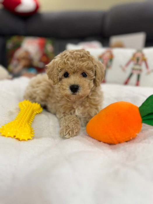 Hi there, I’m Amara! I’m a stunning and rare Apricot Miniature Poodle puppy with a heart full of love and devotion, ready to find my forever family.